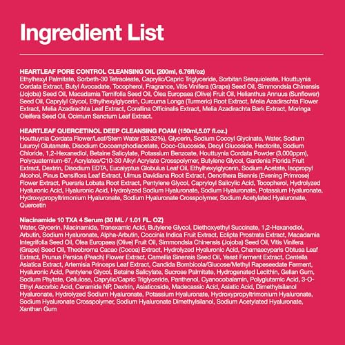 About this item [3-STEP GLASS SKIN ROUTINE] Achieve visibly radiant, smooth skin with this beginner-friendly set — start with deep cleansing oil, refresh with gentle foaming wash, and brighten with TXA serum for that coveted glass skin glow. [STEP 1: DEEP CLEANSING OIL] A deep pore cleanser that won’t clog pores, effective in removing makeup residue and sebum. An essential step for double cleansing, delivering glowy, glass skin results. [STEP 2: GENTLE CLEANSER] Creates a delicate light foam infused with Heartleaf Extract, making it gentle enough for all skin types, especially suitable for deep cleansing oily, combination skin. [STEP 3: Viral TXA SERUM] A daily serum designed to enhance skin clarity and balance with three active ingredients—Niacinamide, TXA, and Arbutin. Naturally pigmented with Vitamin B for a radiant, even complexion.